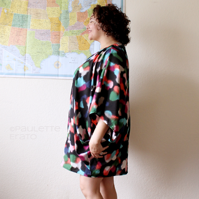 Back to this funky dress. It’s Simplicity 8091 view A. Simplicity describes this as a “cocoon shaped kimono that pulls over head.” That means the hem is a bit narrower and constricting, like a cocoon might be.